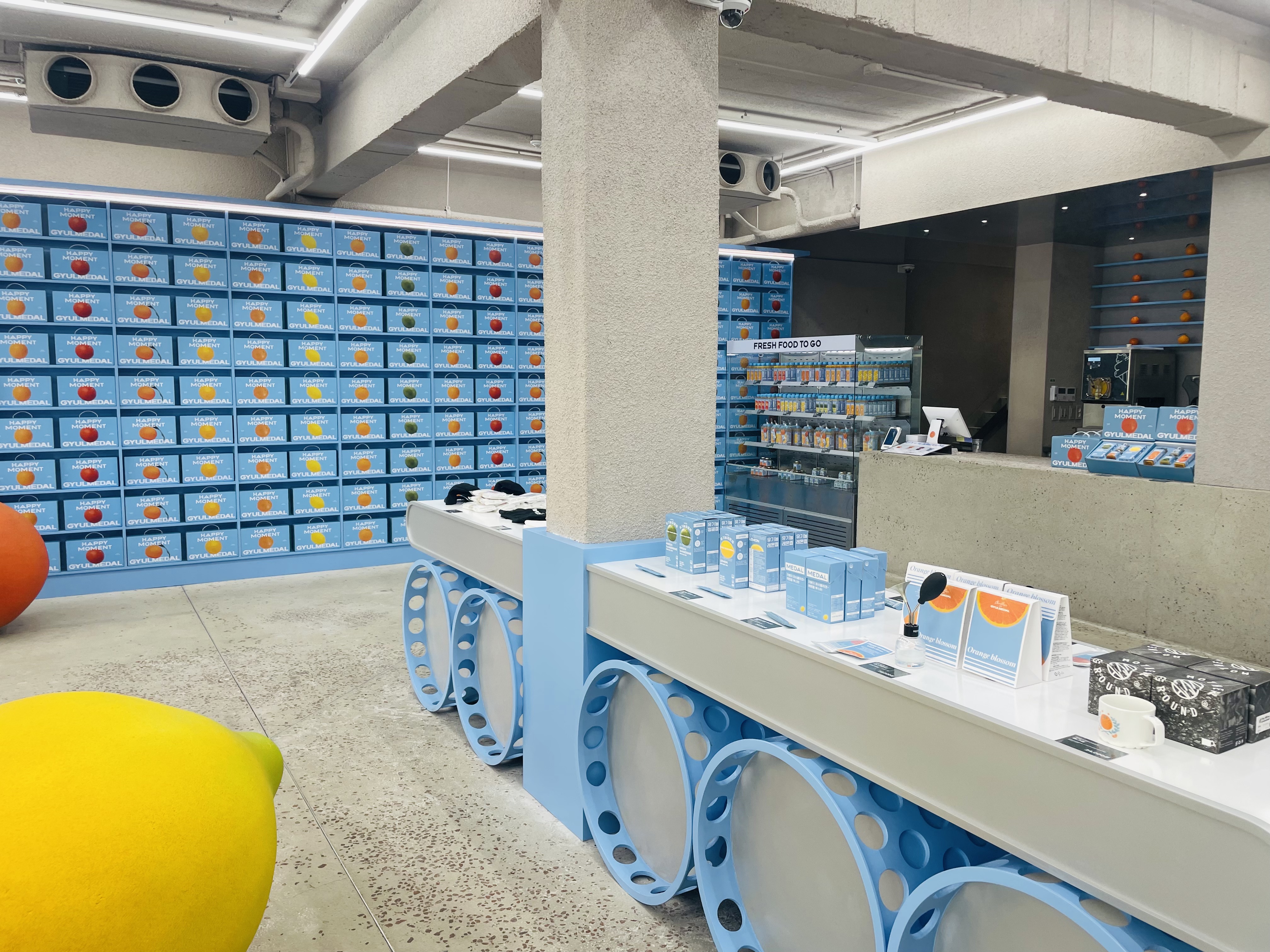 - 매장 곳곳에 놓여 있는 상큼한 느낌을 주는 대형 감귤 오브제와