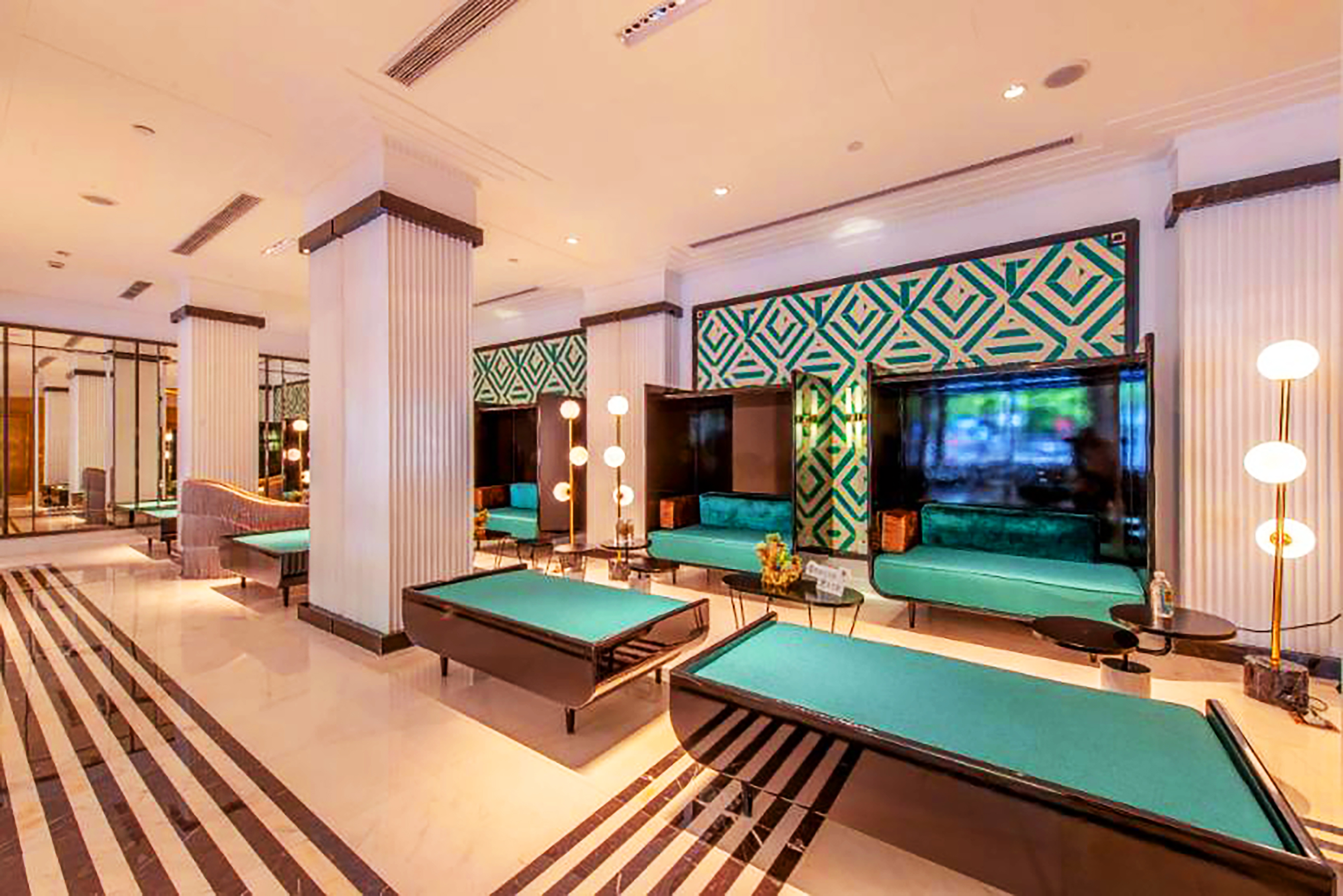 로비는 세련된 녹색과 골드 인테리어가 포인트인 구조로, 밝고 고급스러운 느낌이 들었어요. 프런트 데스크 맞은편에는 앉아서 쉴 수 있는 공간 외에도, 새장 형태의 특이한 휴식 공간이 별도로 마련되어 있었어요.