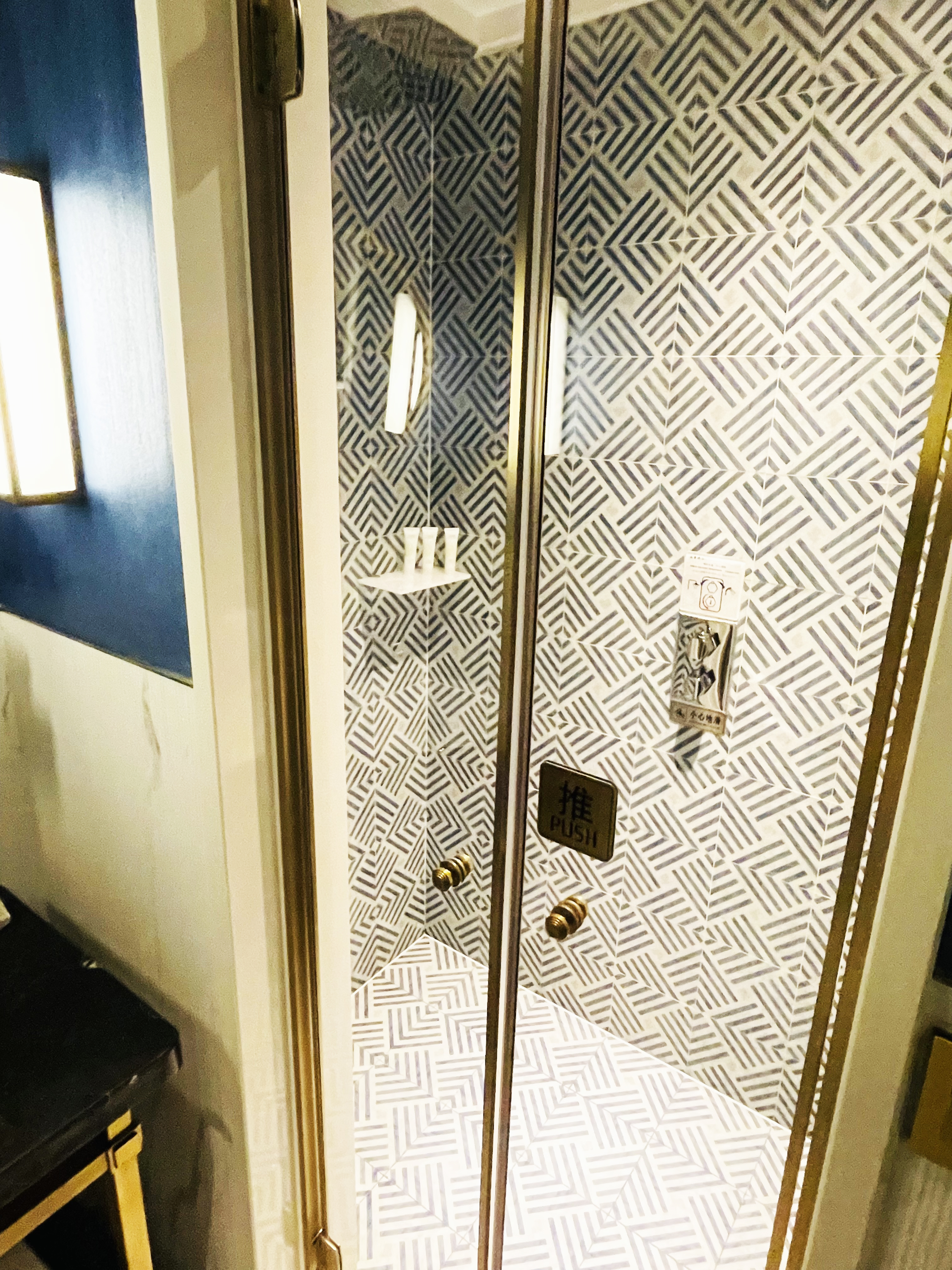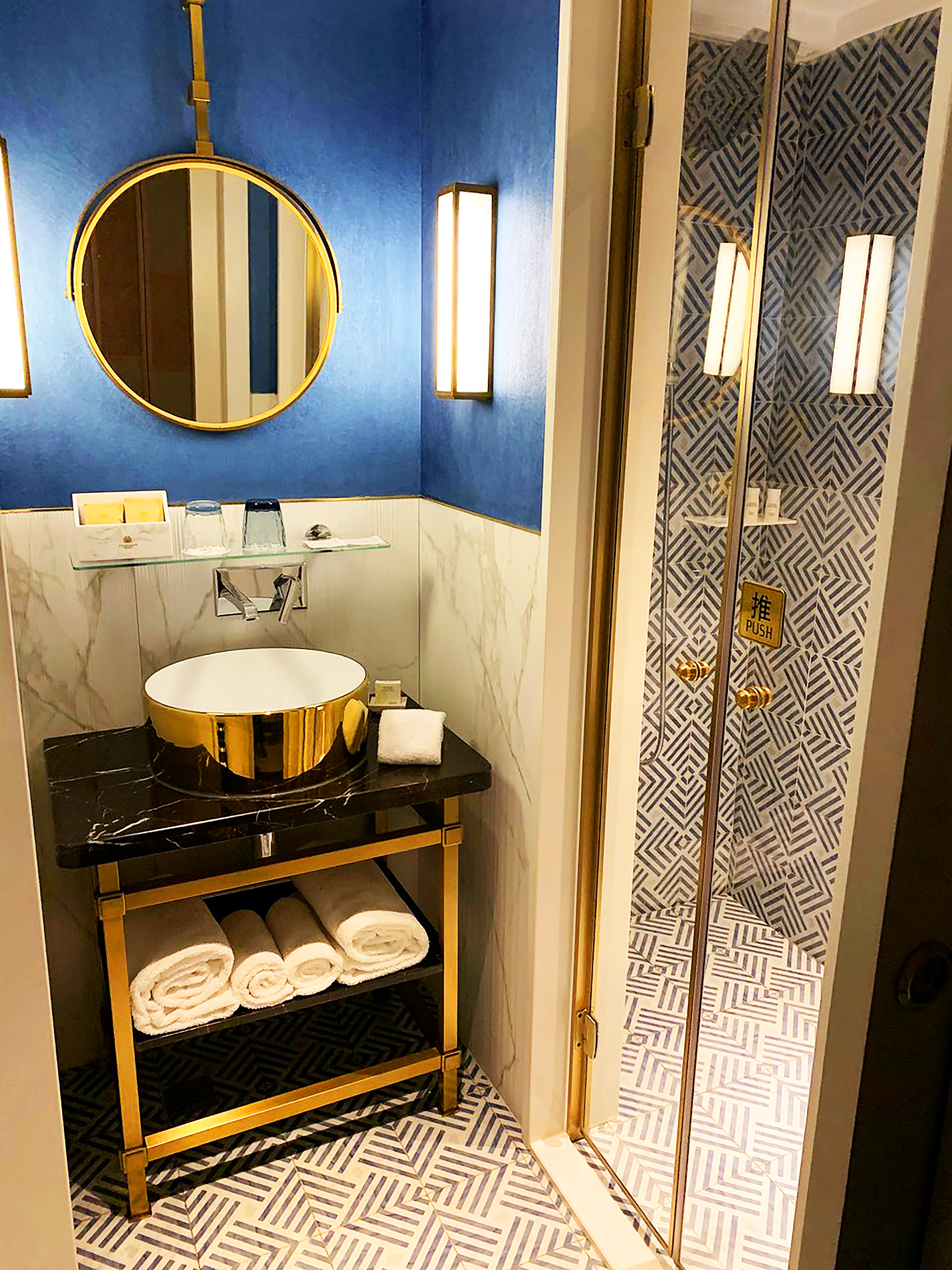 욕실, 세면대, 샤워실은 모두 분리형 구조로 되어 있어서 아침에 동시 사용 시 편리했어요. 대리석 타일과 골드톤 세면대 덕분에 크지는 않지만 프리미엄 느낌을 줬답니다.